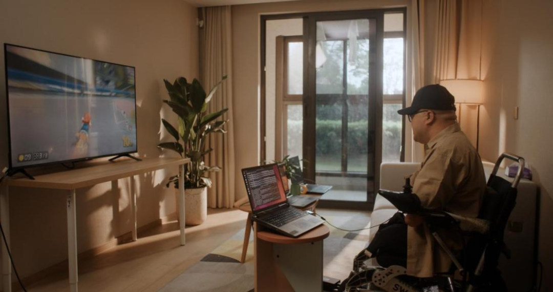 中国首例无线侵入式脑机接口系统前瞻性临床试验受试者术后一个月脑控玩赛车游戏 受访者供图