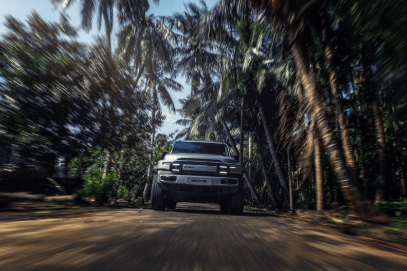 当然,iCAR V23的颜值也很符合秋日露营的气氛。作为5门5座紧凑型纯电动SUV,它选用“方盒子”造型,平直的车身线条透着复古感,圆形灯体调配双幅平行LED日间行车灯的三段式规划,又增添了现代气味,行进在秋日山林间,顺手一拍都是美观的相片。车身有橙绿黑白灰银六种色彩可选,橙色热心生机,绿色清新自然,银色满是科技感,不管是停在金黄的稻田边,仍是碧绿的树林旁,都能和景色完美交融。